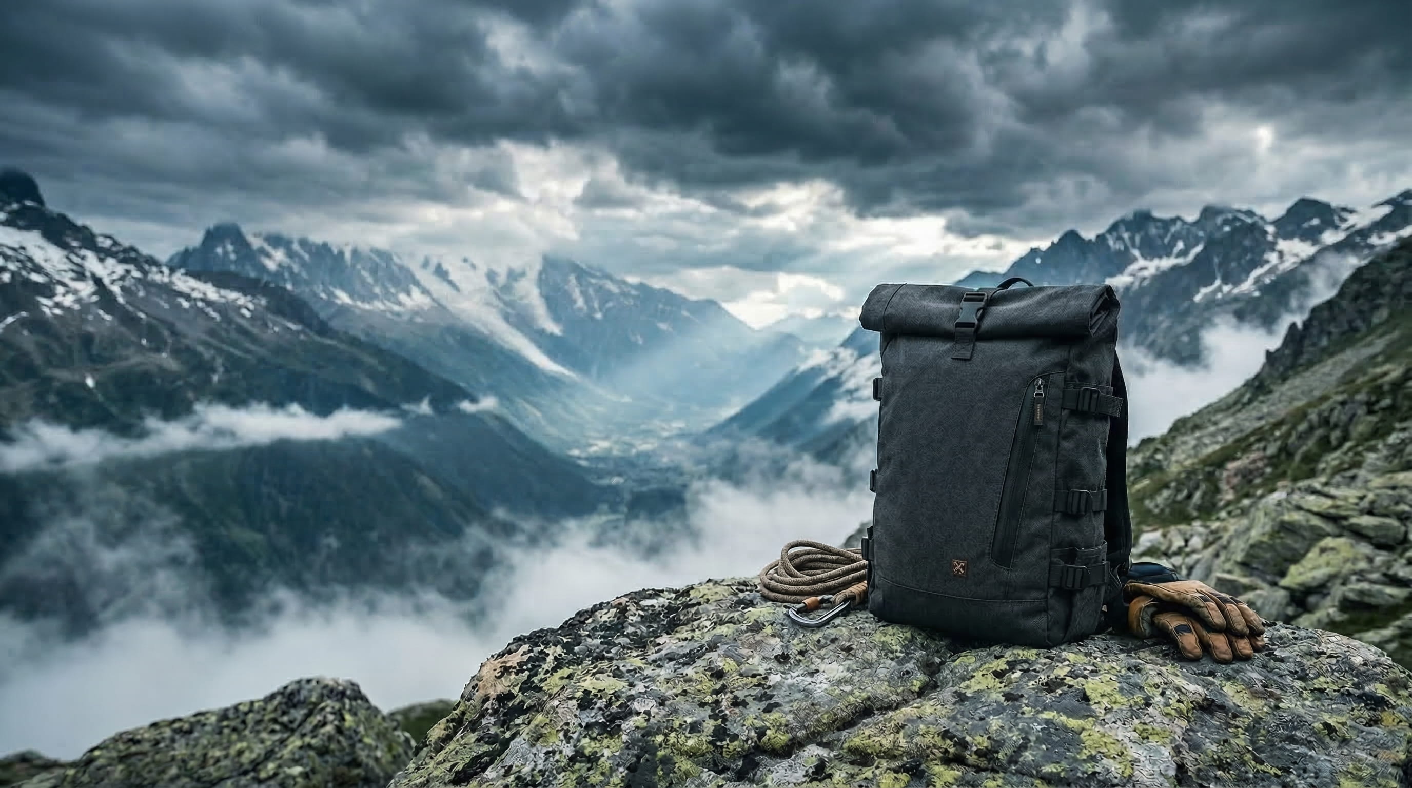 Most frames were directed at eye level with a medium telephoto focal length, shallow depth of field keeping the figure sharp against a softened mountain background. One frame places the product alone on a rock beside a climbing rope and gloves, objects chosen to establish the most immediate context for the bag without limiting what it could be used for.
