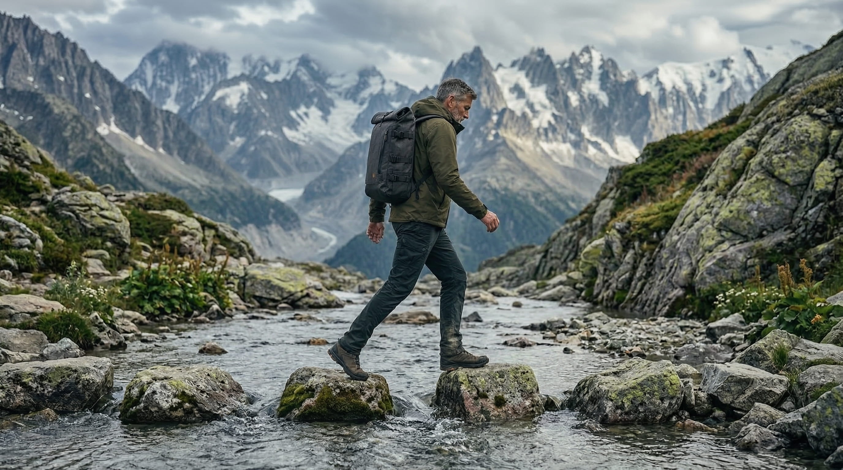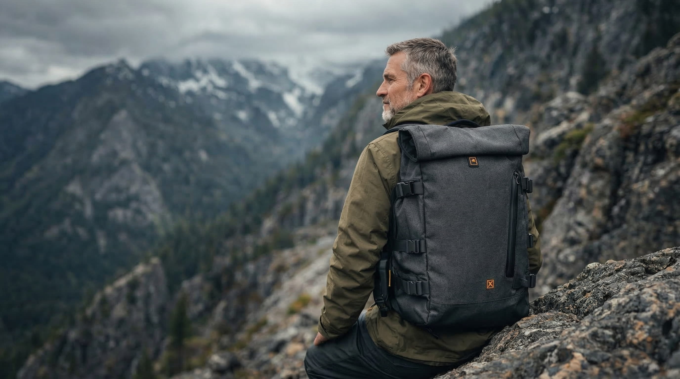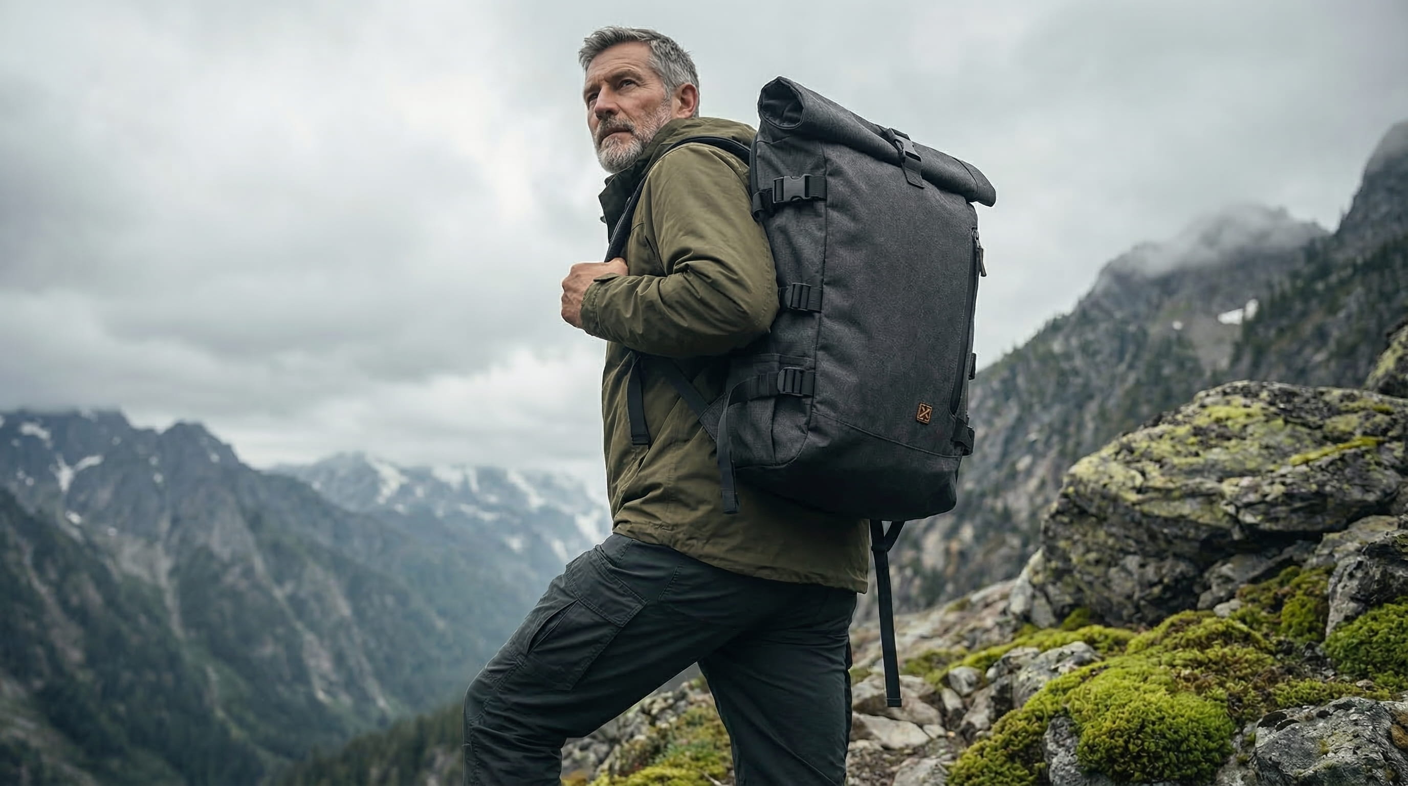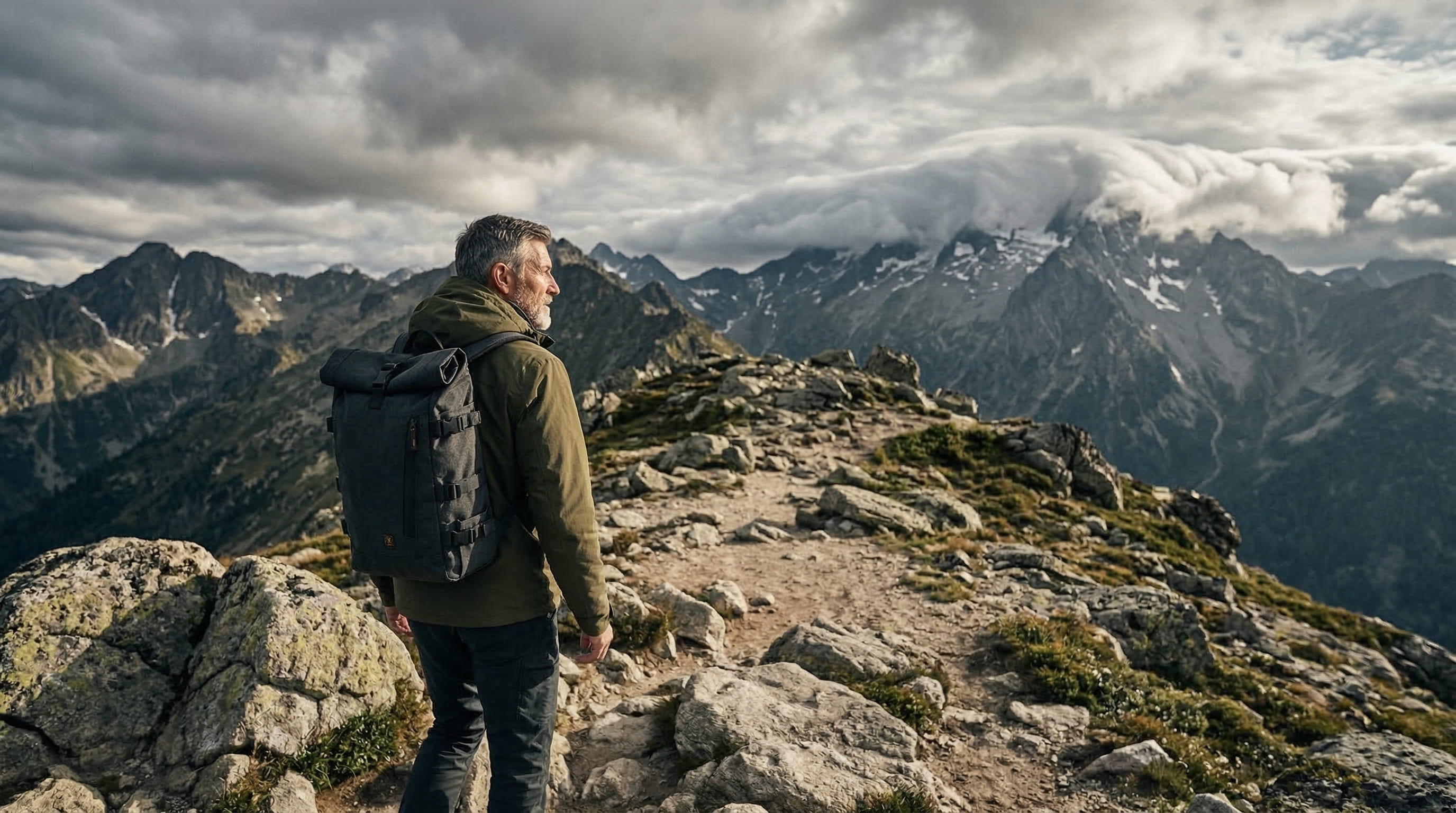 The choice was someone mid-fifties, above the treeline, in weather that has not decided yet. Someone whose relationship with equipment has deepened over time. Someone who chooses a backpack knowing exactly what they need from it. That kind of certainty reads in the way a person moves through terrain.