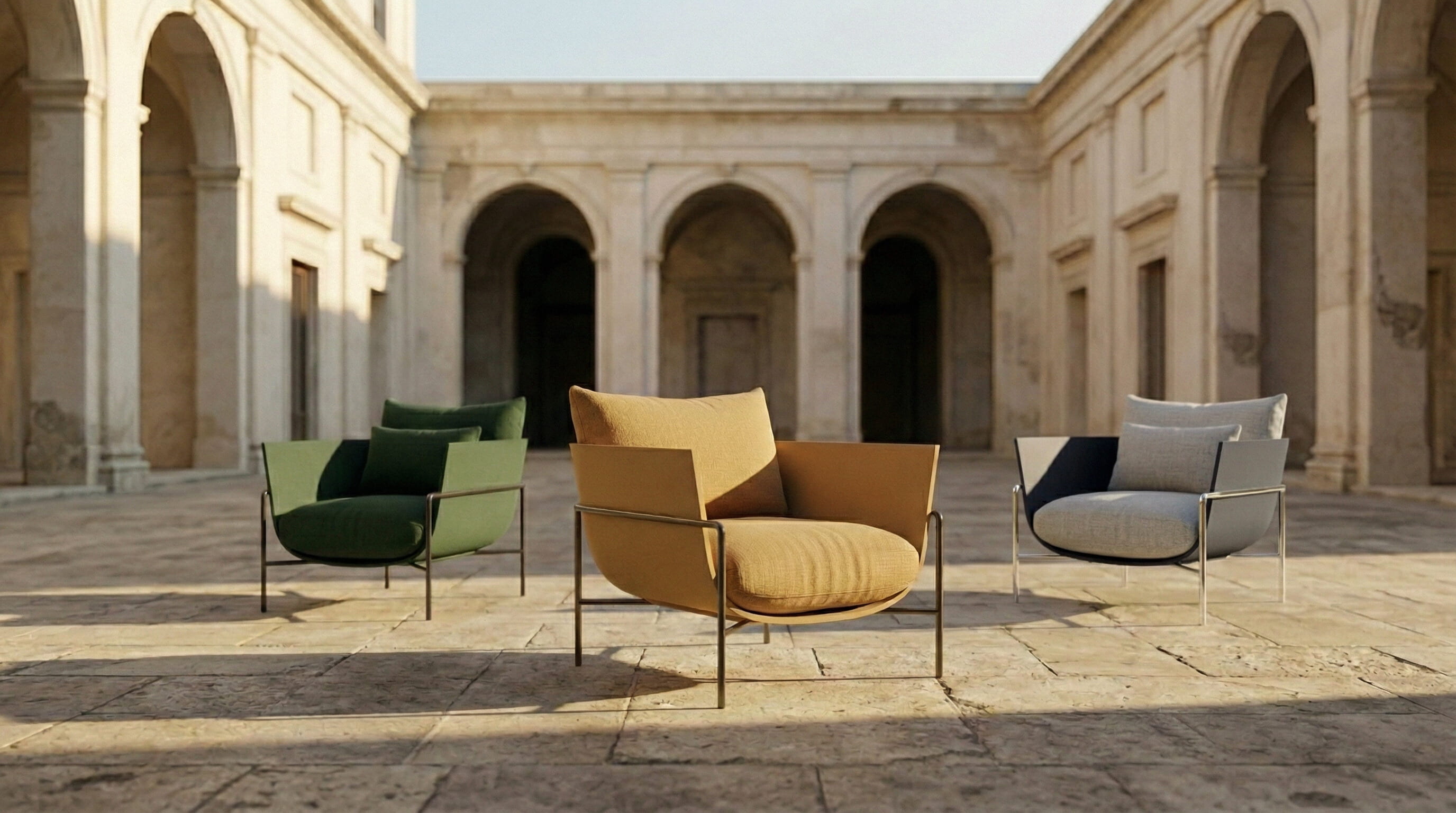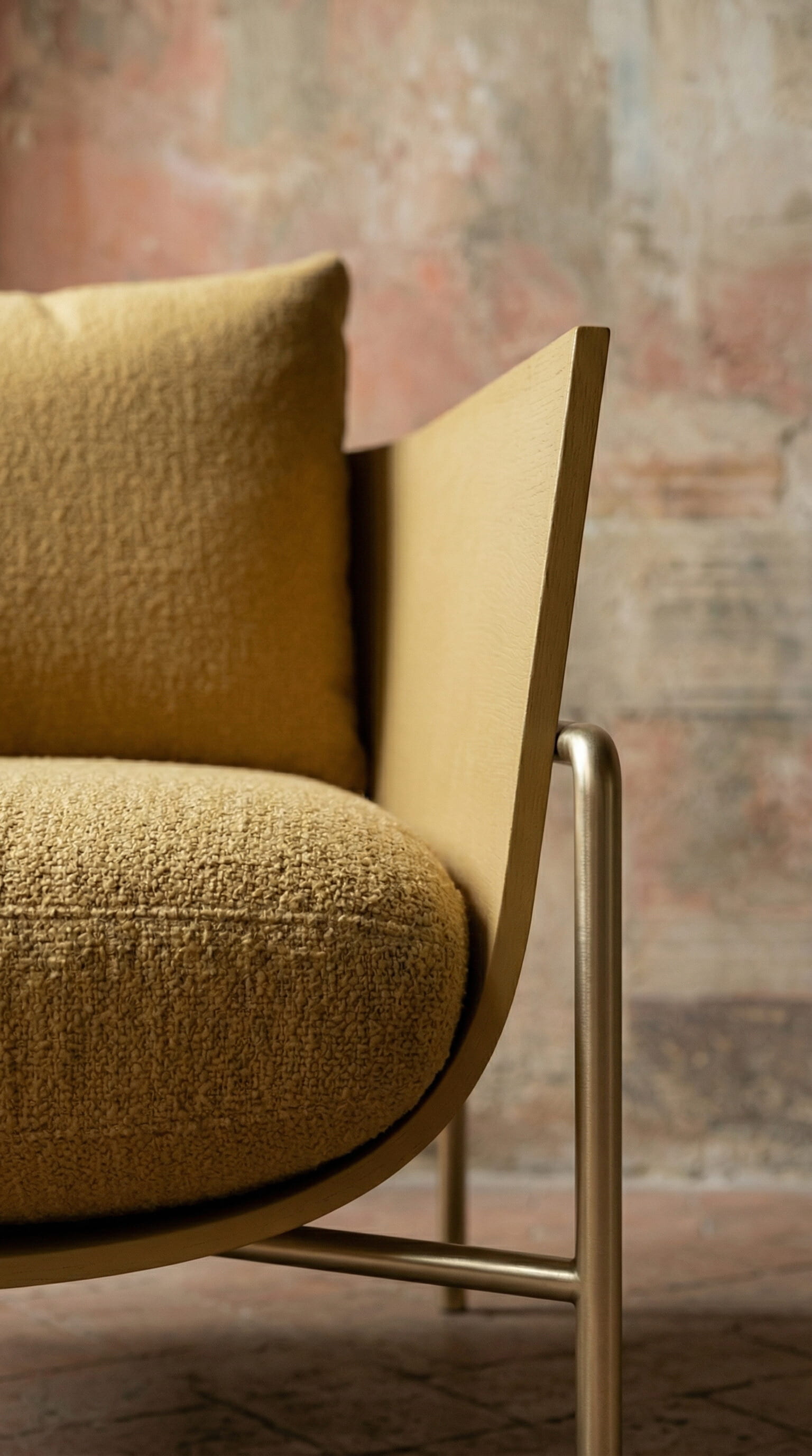 A contemporary chair with a thin metal frame and bouclé cushions placed inside an Italian palazzo with centuries of use still visible on its walls. That was the spatial argument from the beginning.