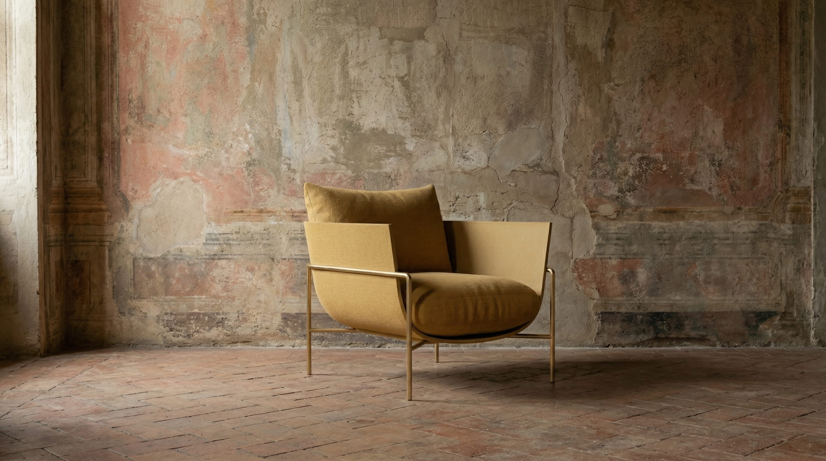 The frescoed walls were chosen because the space carries time in a way that very few interiors do. The plaster is lifting, the pigment has faded in layers, the terracotta floor carries the marks of everything that happened there before. A newly designed object inside that kind of room reads differently than it would against a white wall or inside a clean studio.