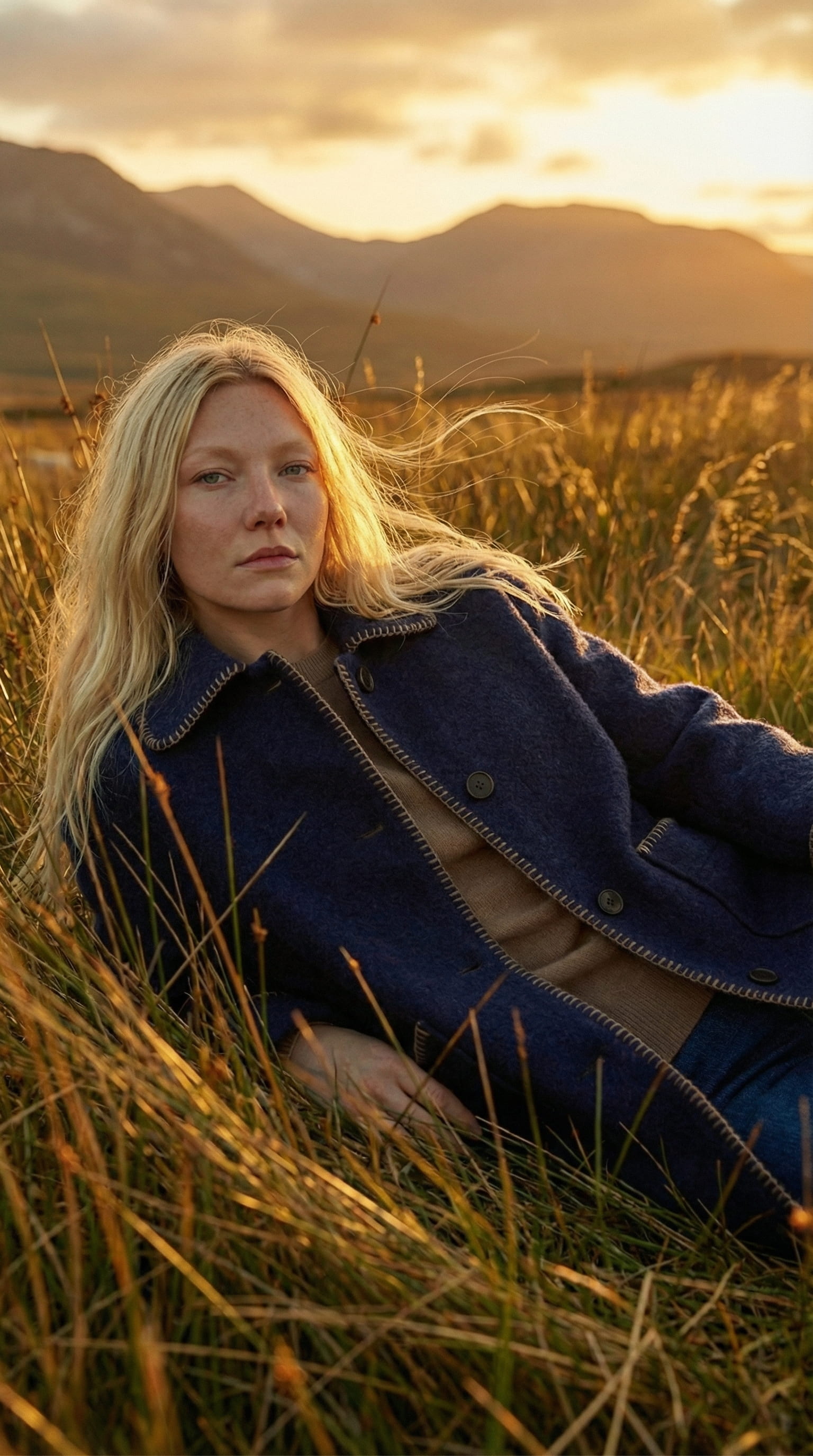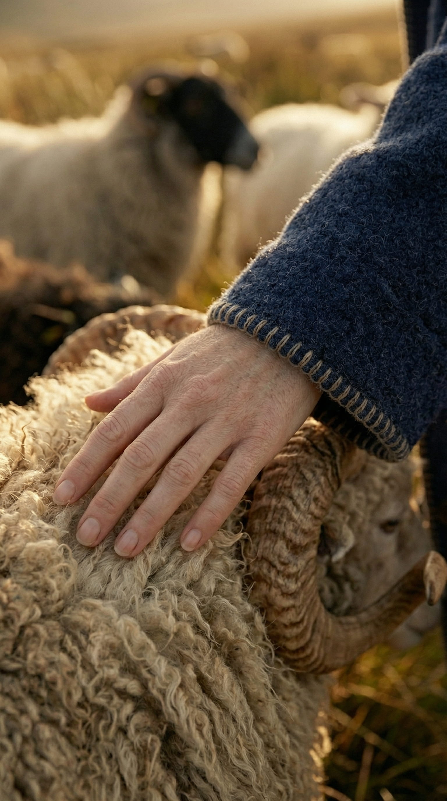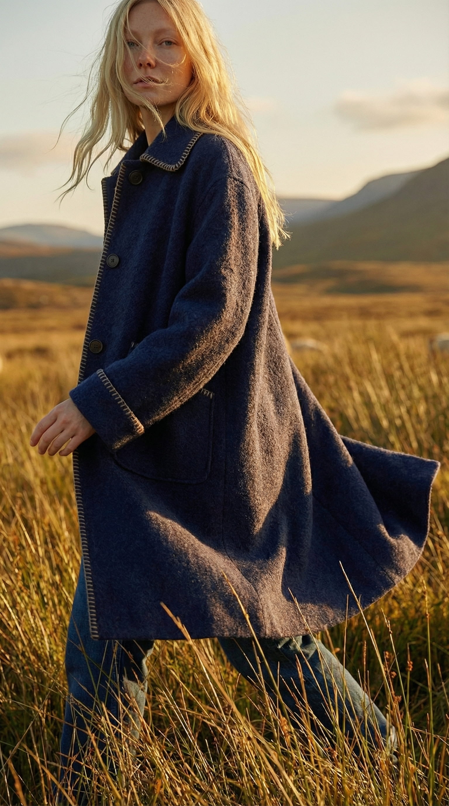 All frames were directed in golden hour light, lateral and grazing, because at that angle texture reads before shape does. The wool needed to be visible as a material, not just as a silhouette. Every frame with the model was directed from eye level or below, with grass in the foreground, to place her inside the landscape rather than posed in front of it.