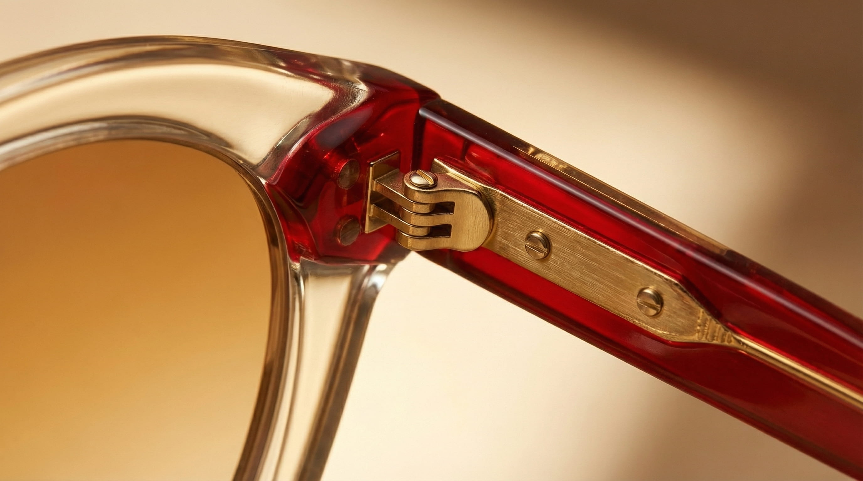 The macro closes on the hinge, where the transparent acetate meets the red and the gold. That detail was chosen because it is where the design makes its clearest statement.