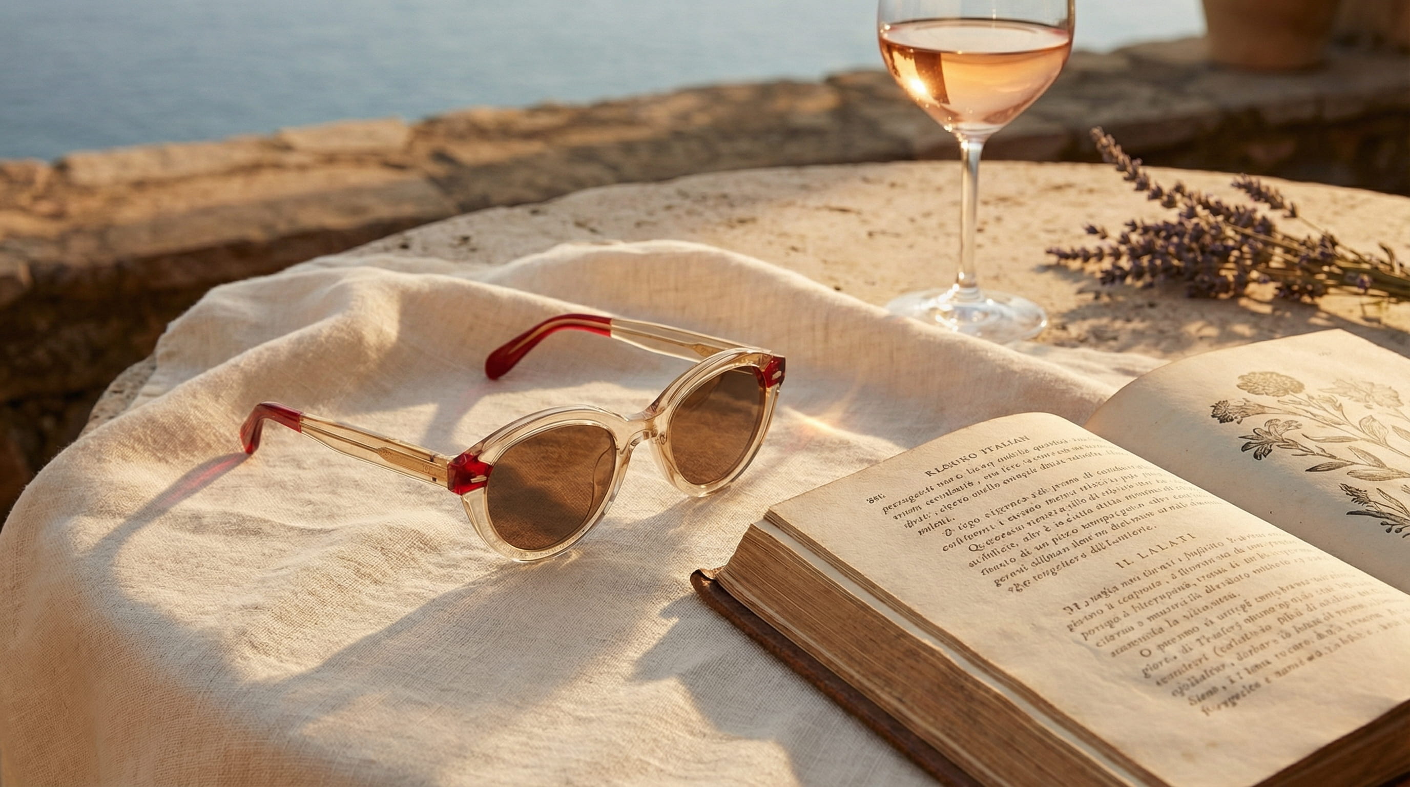 The still life places the glasses beside an Italian book and a glass of rosé on a stone surface. These objects were chosen deliberately. A specific afternoon, not a generic summer.