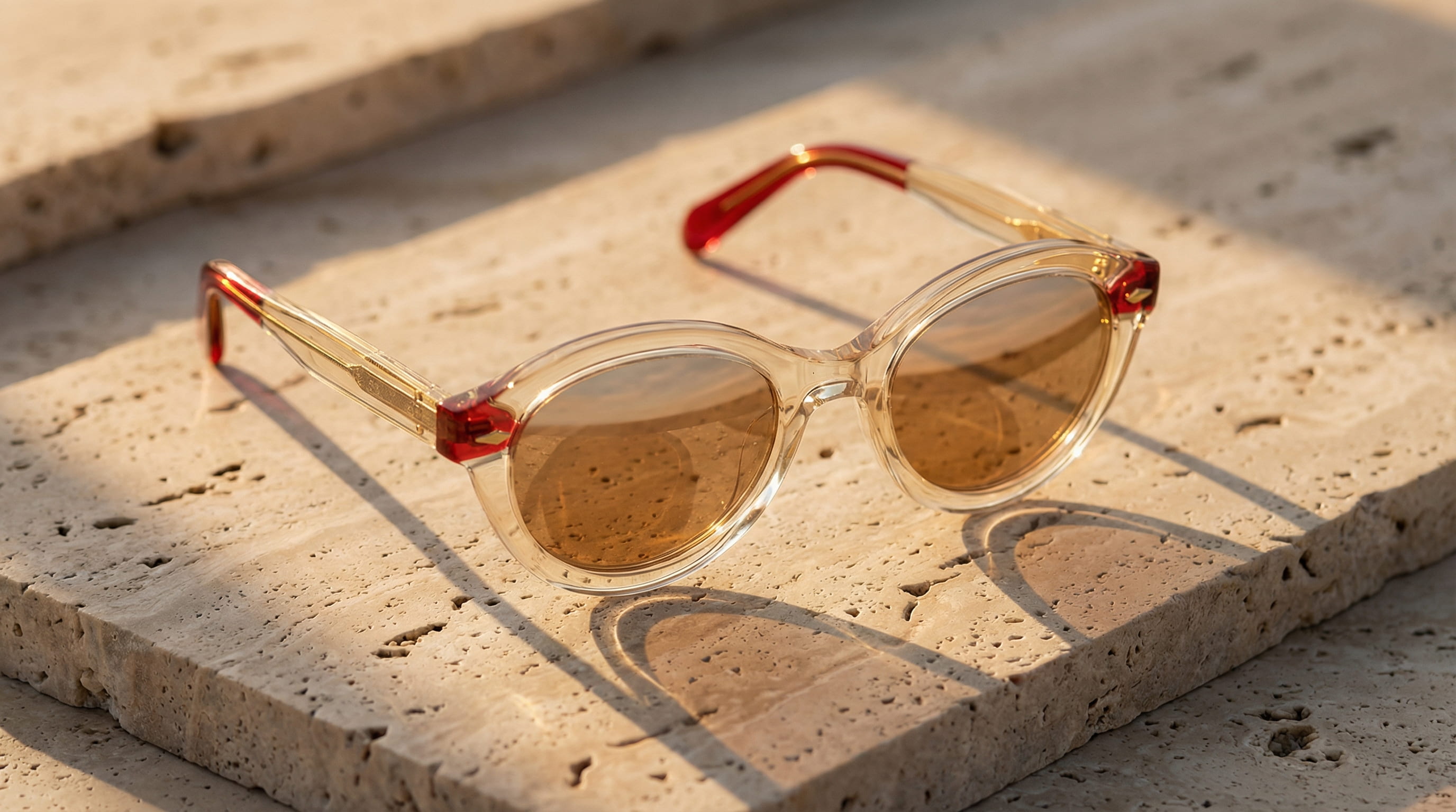 The starting point was an elegant frame with a touch of modernity and the feeling of somewhere worth being. Transparent acetate, red temples, gold hardware. The kind of object that belongs to a good summer afternoon.