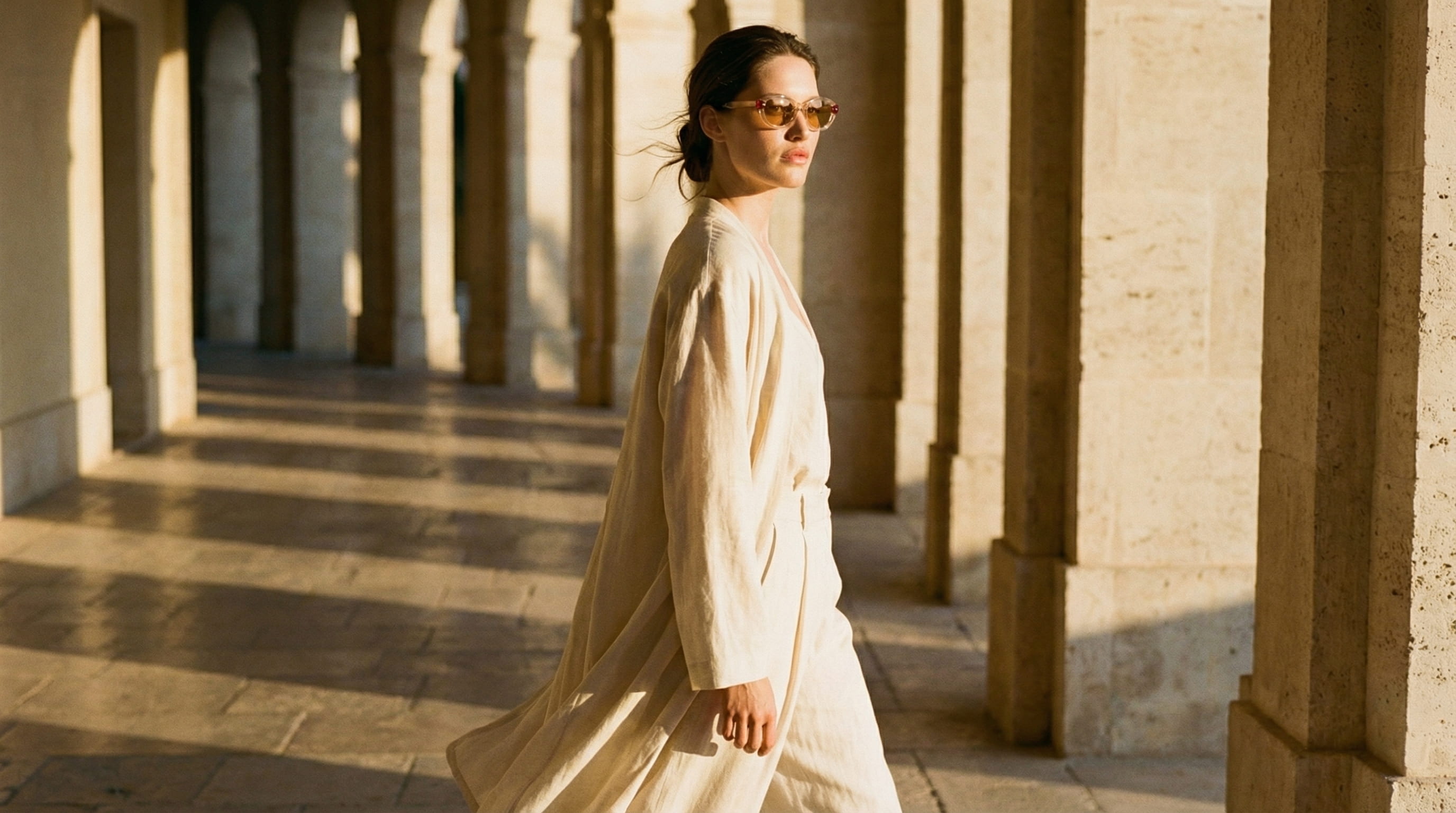 The Mediterranean was chosen as the visual world for that reason. Limestone colonnades, travertine surfaces, late afternoon light that arrives at an angle and stays long enough to cast shadows worth composing around. All frames with the model were directed inside that architecture at golden hour, with lateral light that grazes the stone and the frame in the same gesture. The model was kept in profile or three-quarter angle throughout so the eye goes to the glasses rather than the face wearing them.