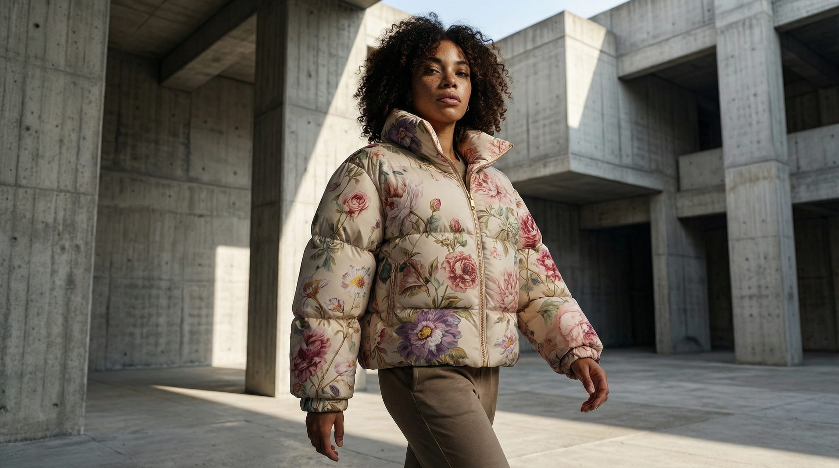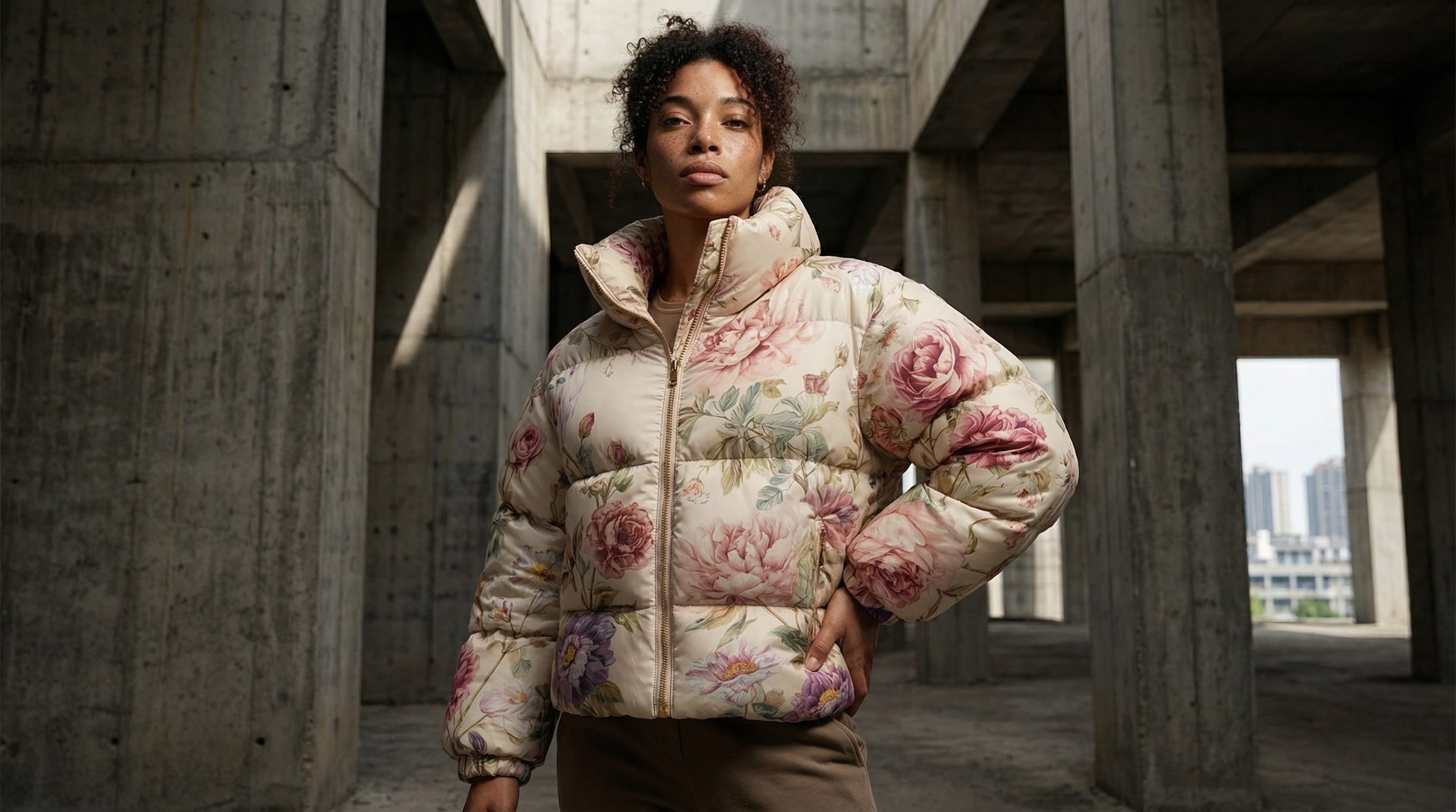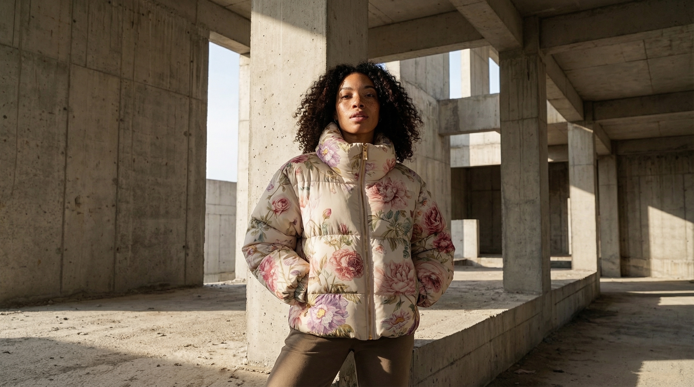 The jacket was already floral and feminine enough. The creative decision was to place it inside raw brutalist architecture precisely because the environment would not accommodate it. Unfinished concrete structures, hard geometry, no softness anywhere in the frame. The contrast was the campaign.