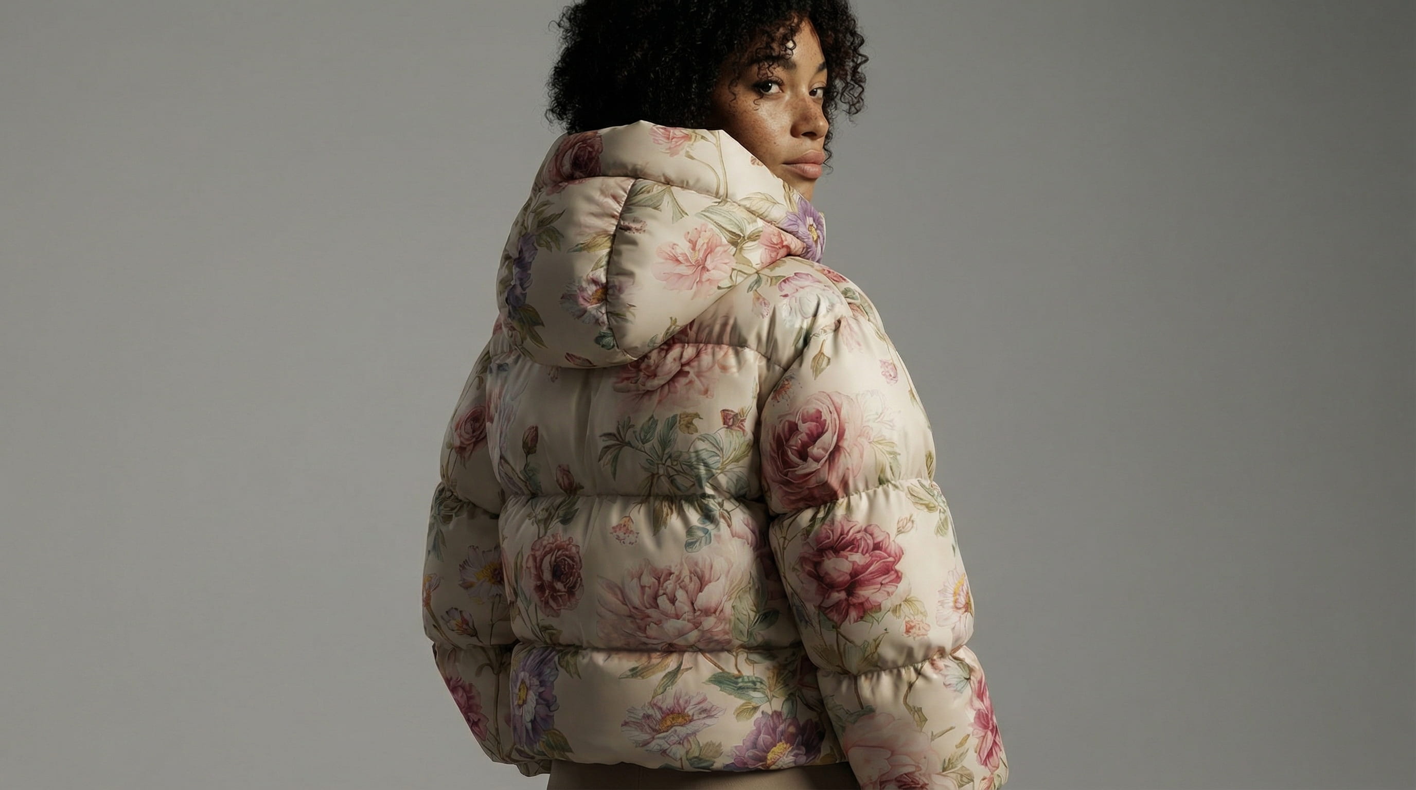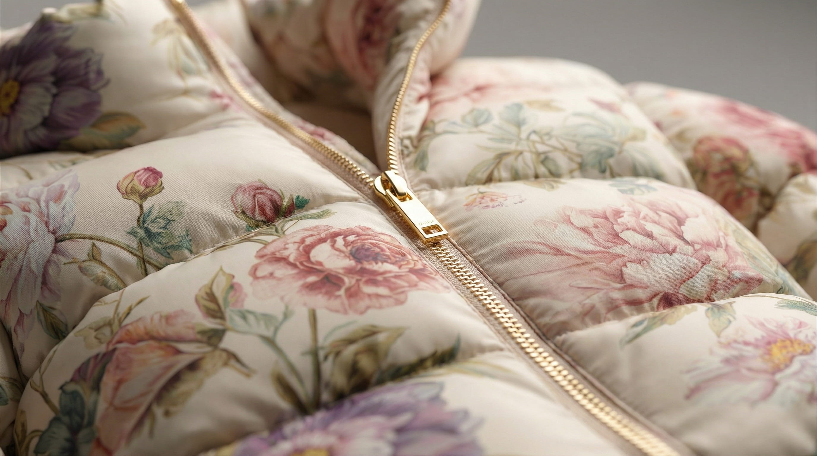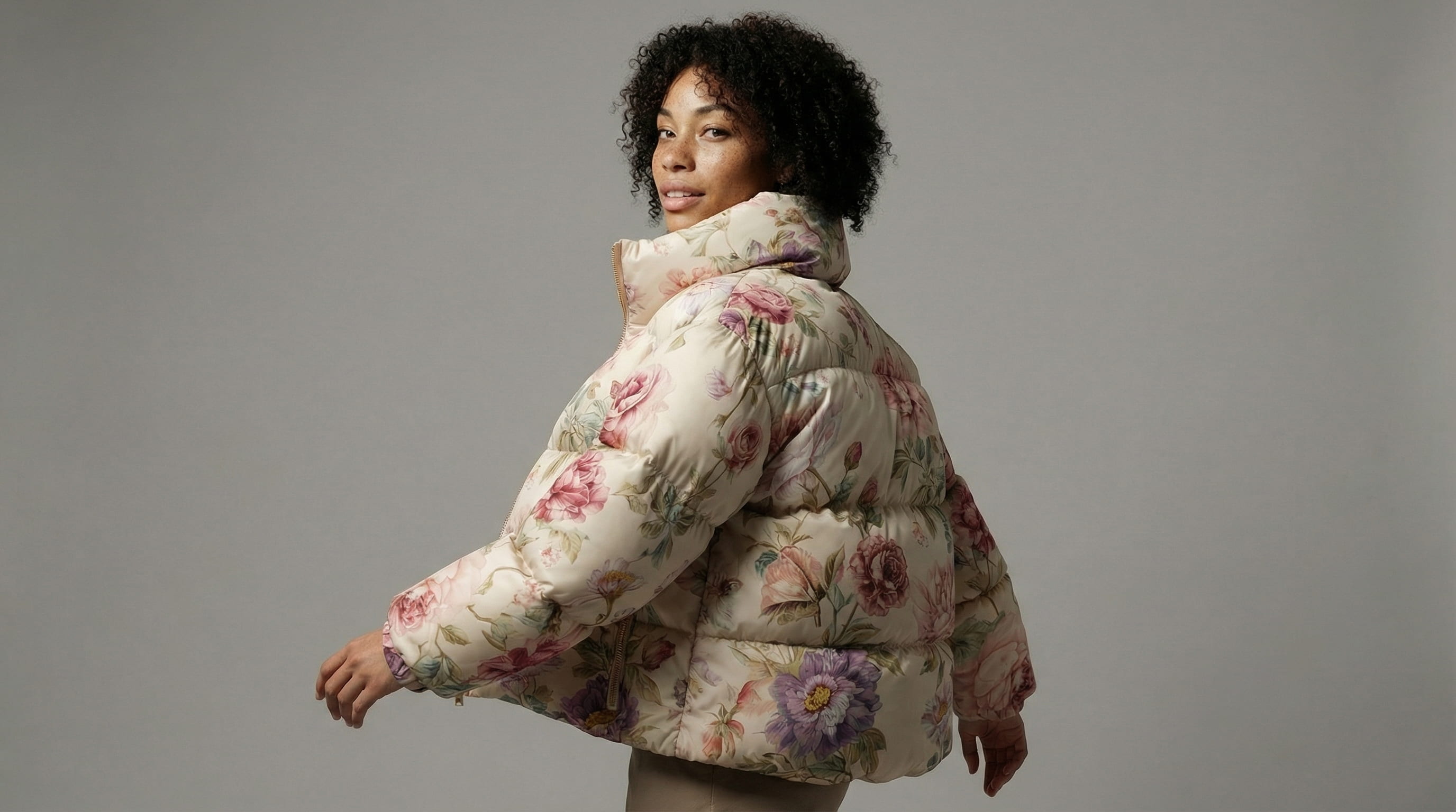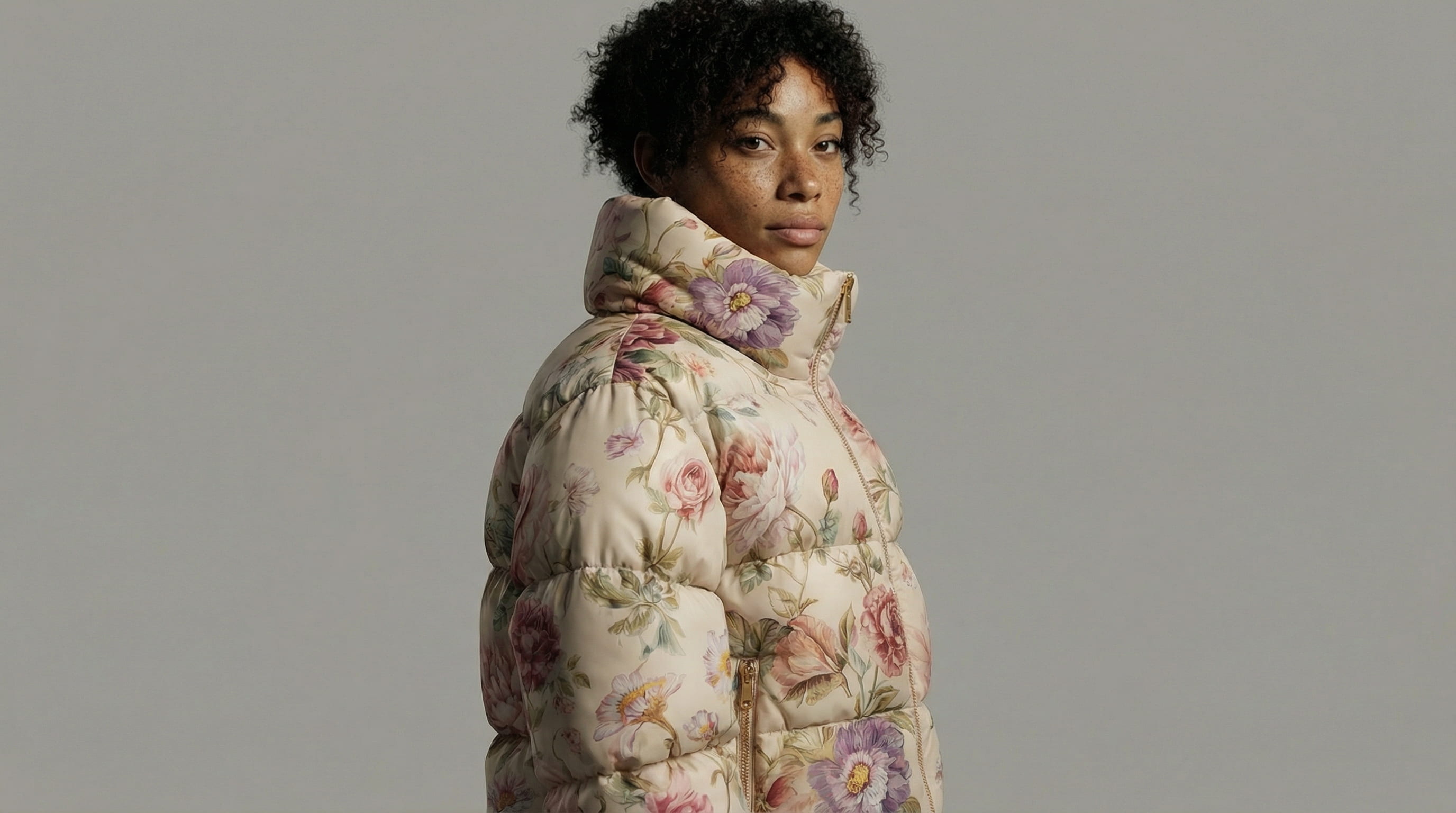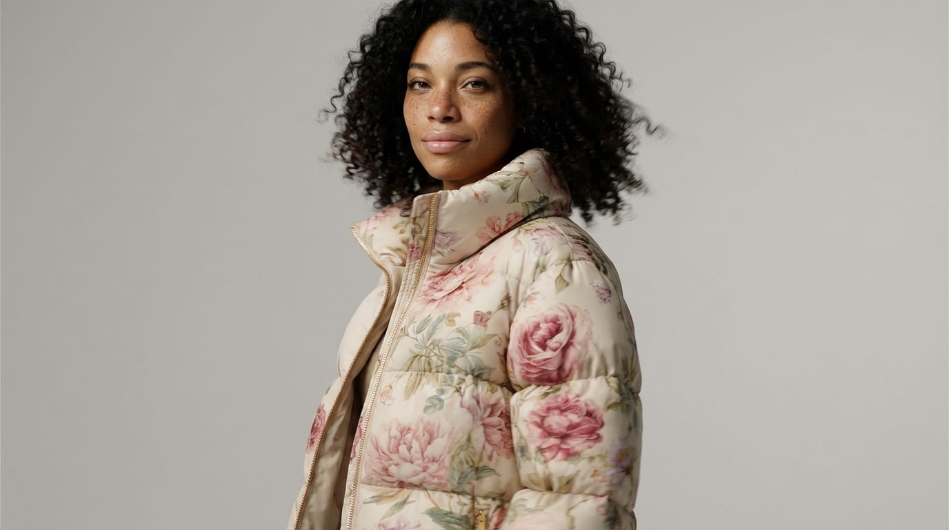 The lookbook moves through the jacket systematically: how it sits on the body from the front, the side, the back. The volume of the quilted panels. The gold zip against the botanical print. A final macro frame where the flowers are close enough to read as individual brushstrokes.