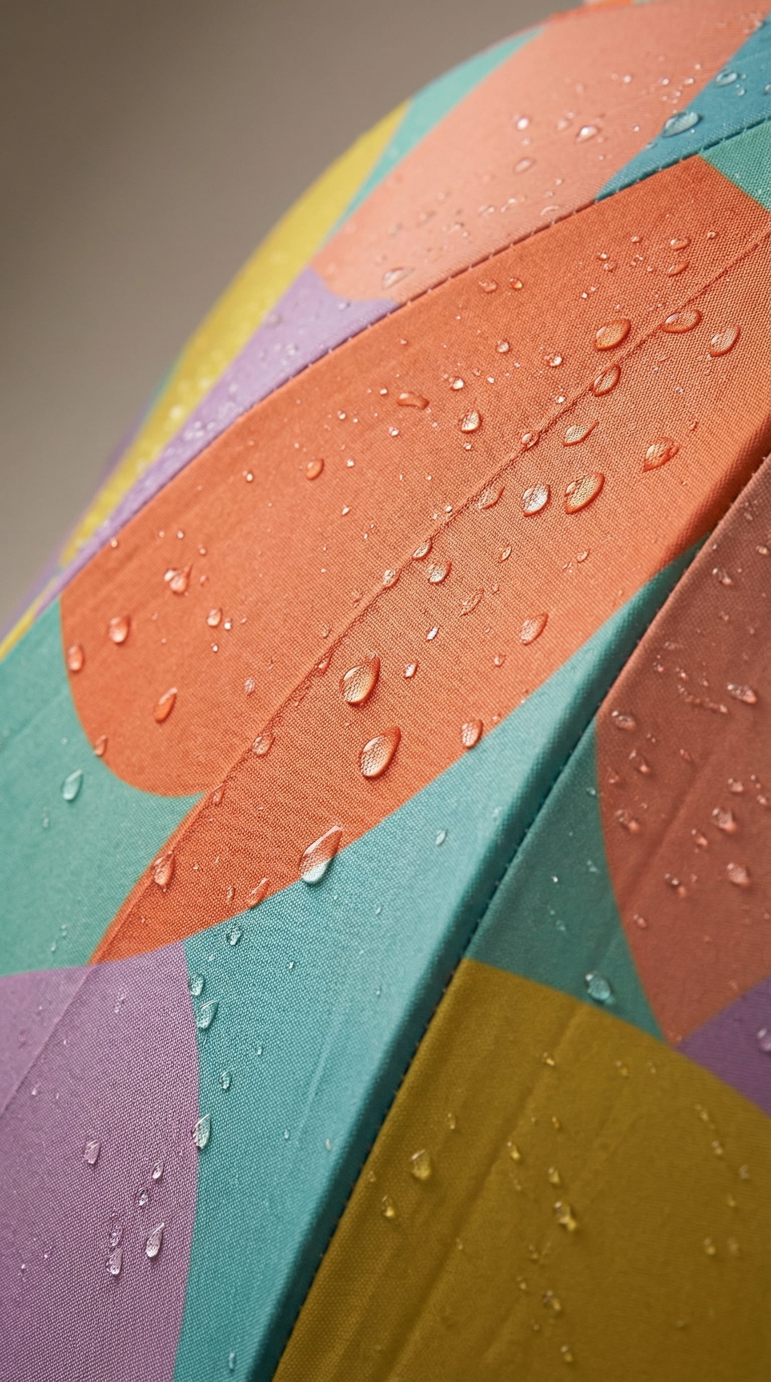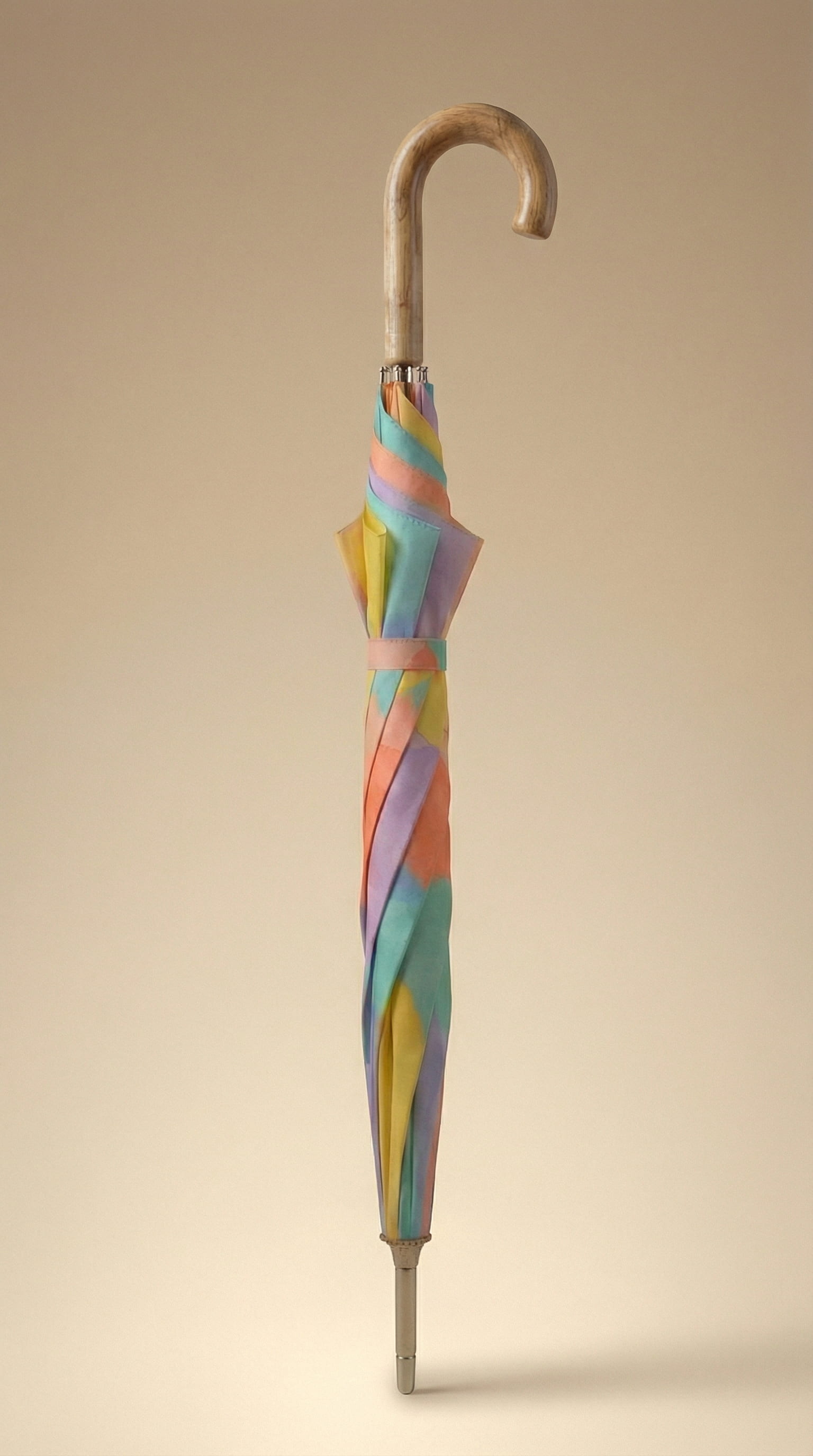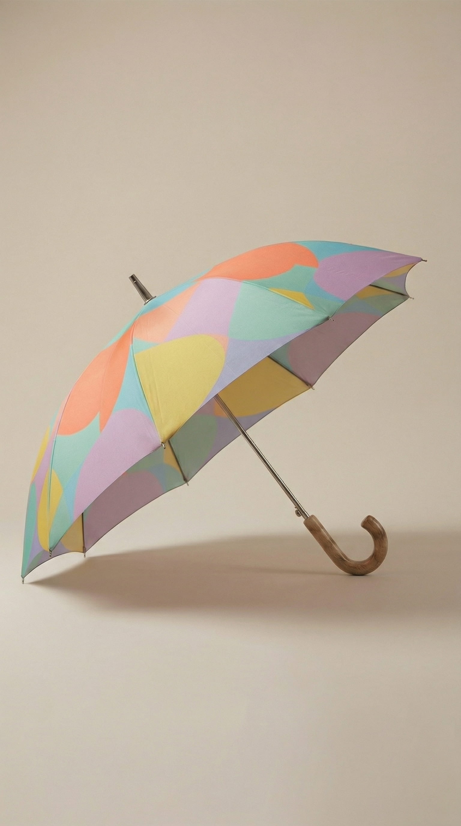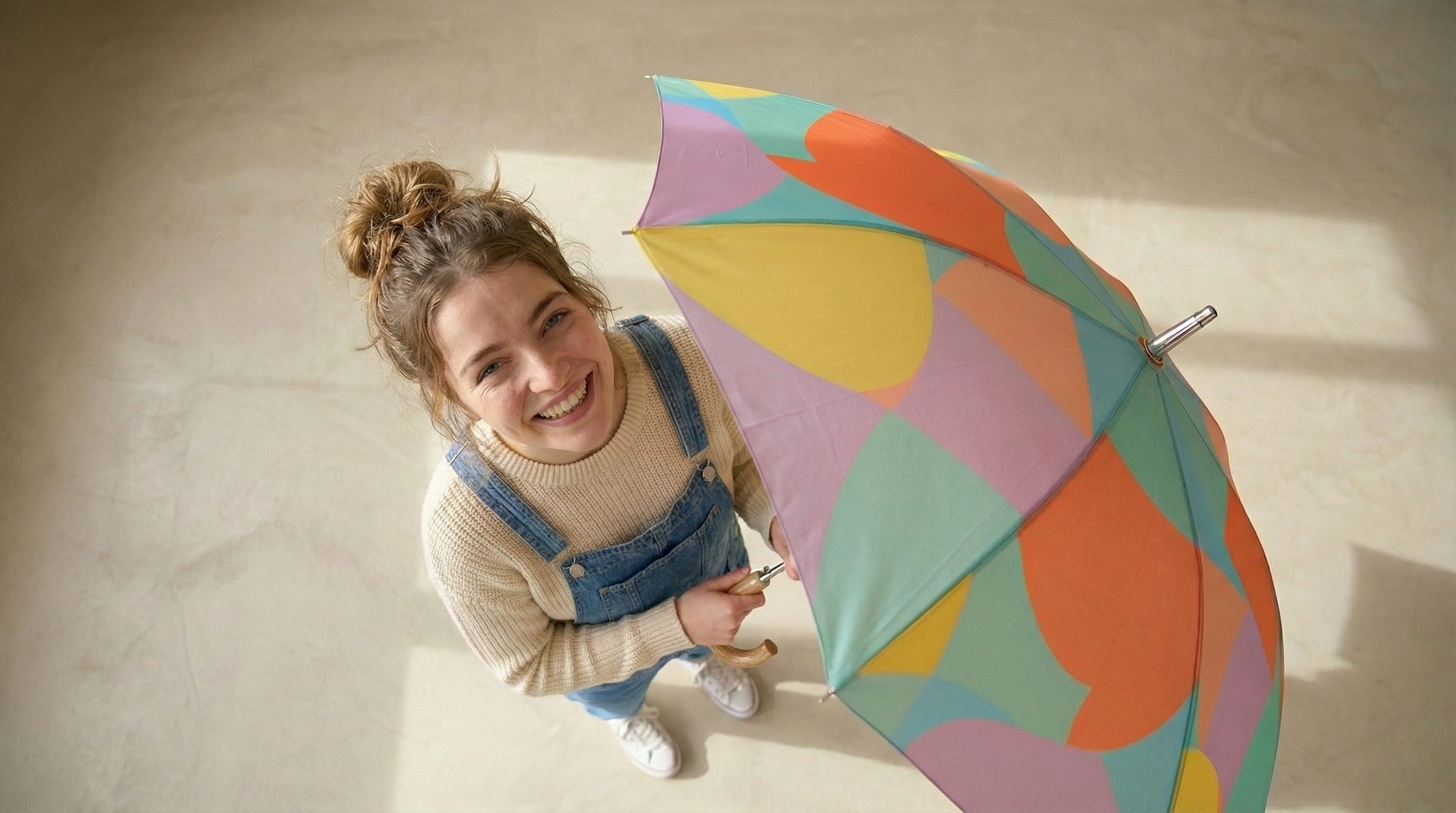 Studio frames were directed with soft natural light on a neutral background, the umbrella open, closed, and in detail. One overhead shot was directed from a high angle looking straight down to show the full print as a flat graphic. The street frame was directed in overcast urban light with the model mid-turn, a wide angle focal length that keeps both figure and architecture readable. The macro was directed to show the water-repellent surface with droplets still sitting on the fabric, communicating function without copy.